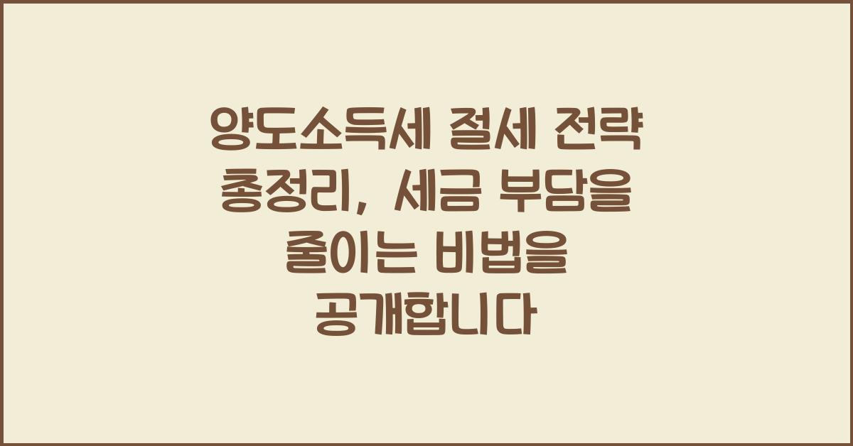 양도소득세는 부동산이나 주식을 팔면서 발생하는 이익에 대해 부과되는 세금입니다. 요즘 많은 분들이 이 세금 때문에 고민하고 계시죠. 저도 얼마 전, 부동산을 처분하면서 많은 고민을 했던 기억이 납니다. 그렇다면 양도소득세 절세 전략 총정리를 통해 세금 부담을 어떻게 줄이는지 알아볼까요?